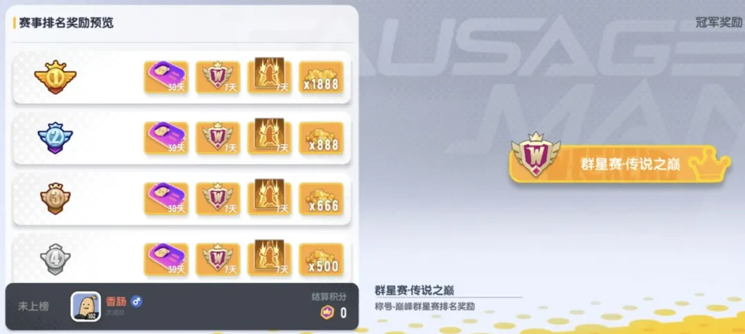 第1-4名还将会获得【派对卡卡面-巅峰赛明星专属】限时派对卡卡面、【群星赛·传说之巅】限时称号、【冠军登场】限时入队动作