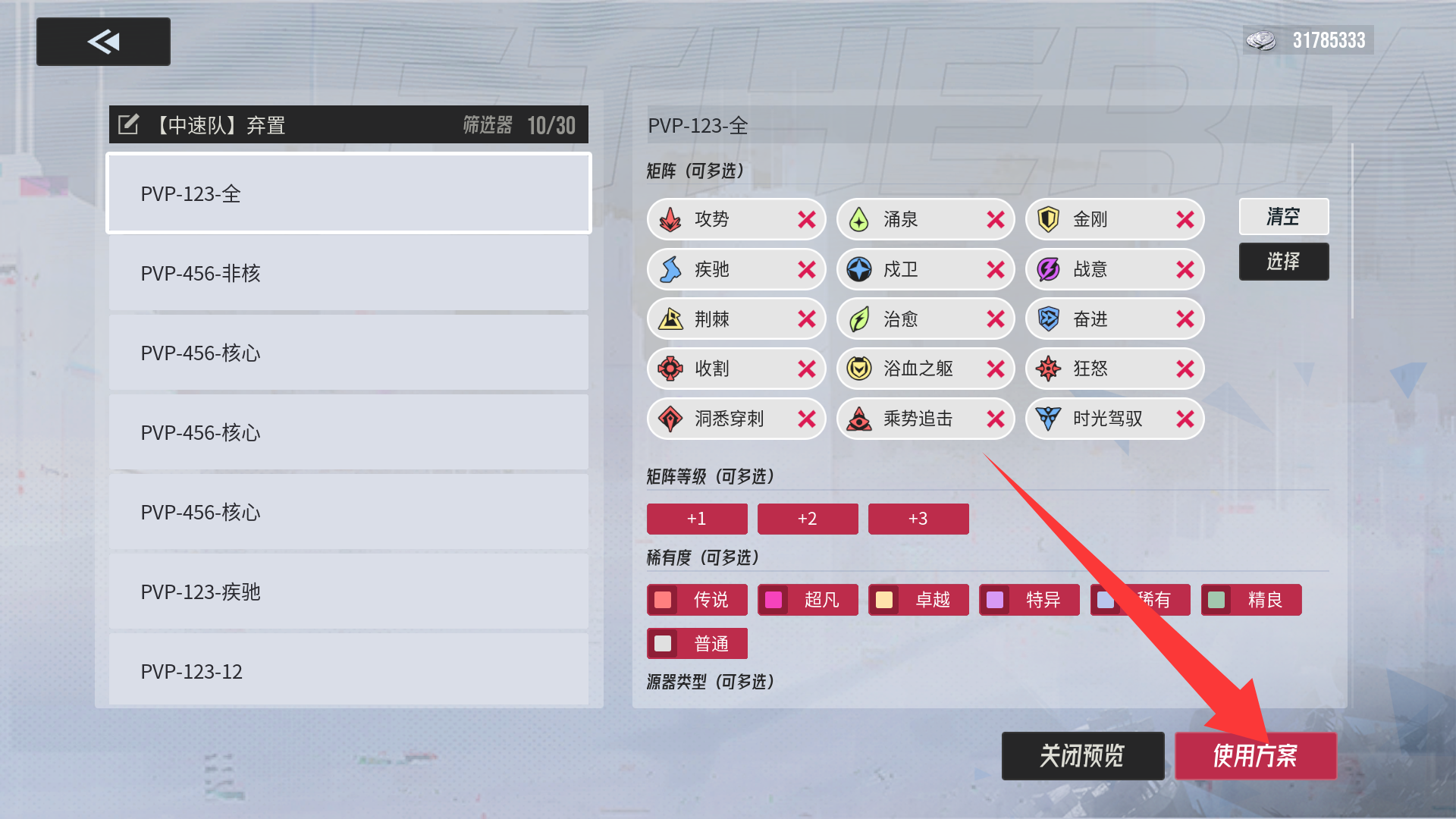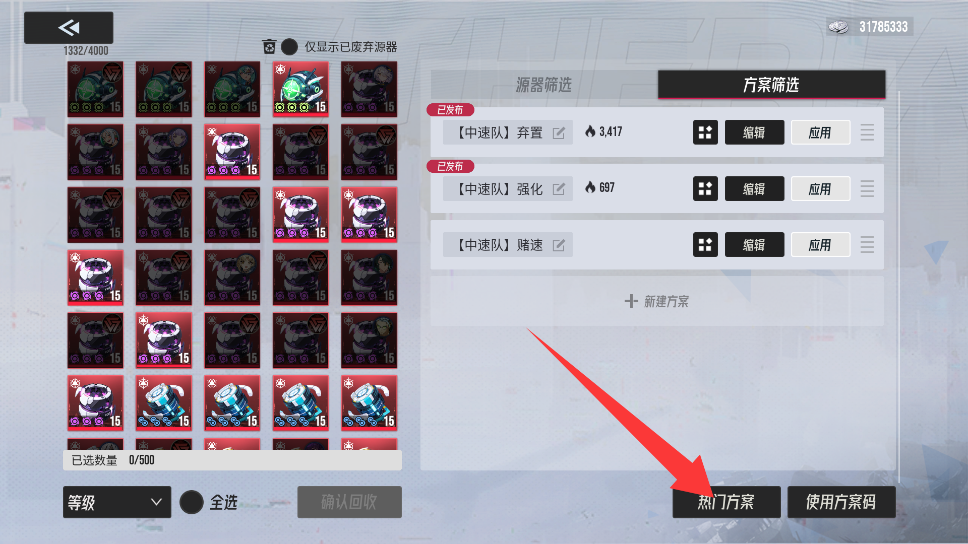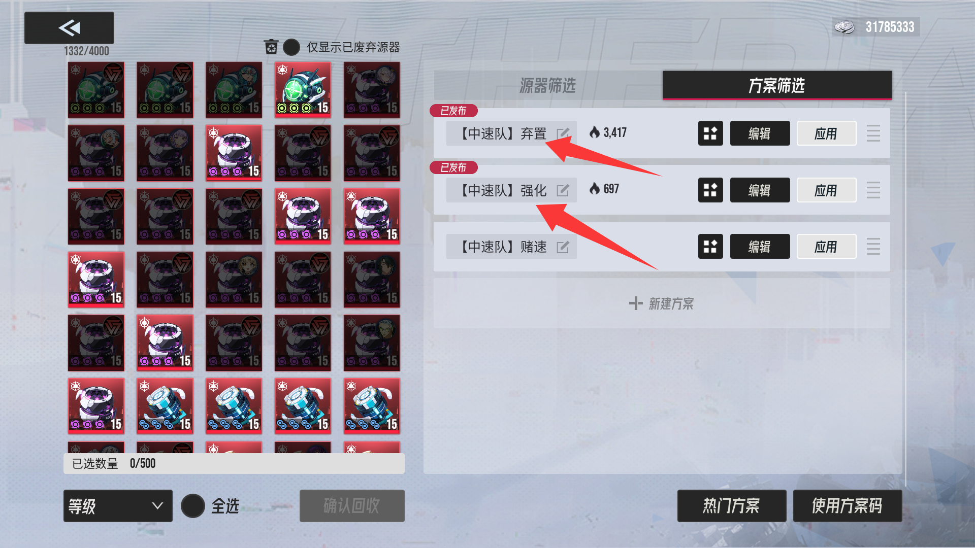(强化方案码为一键筛选需要强化的源器)