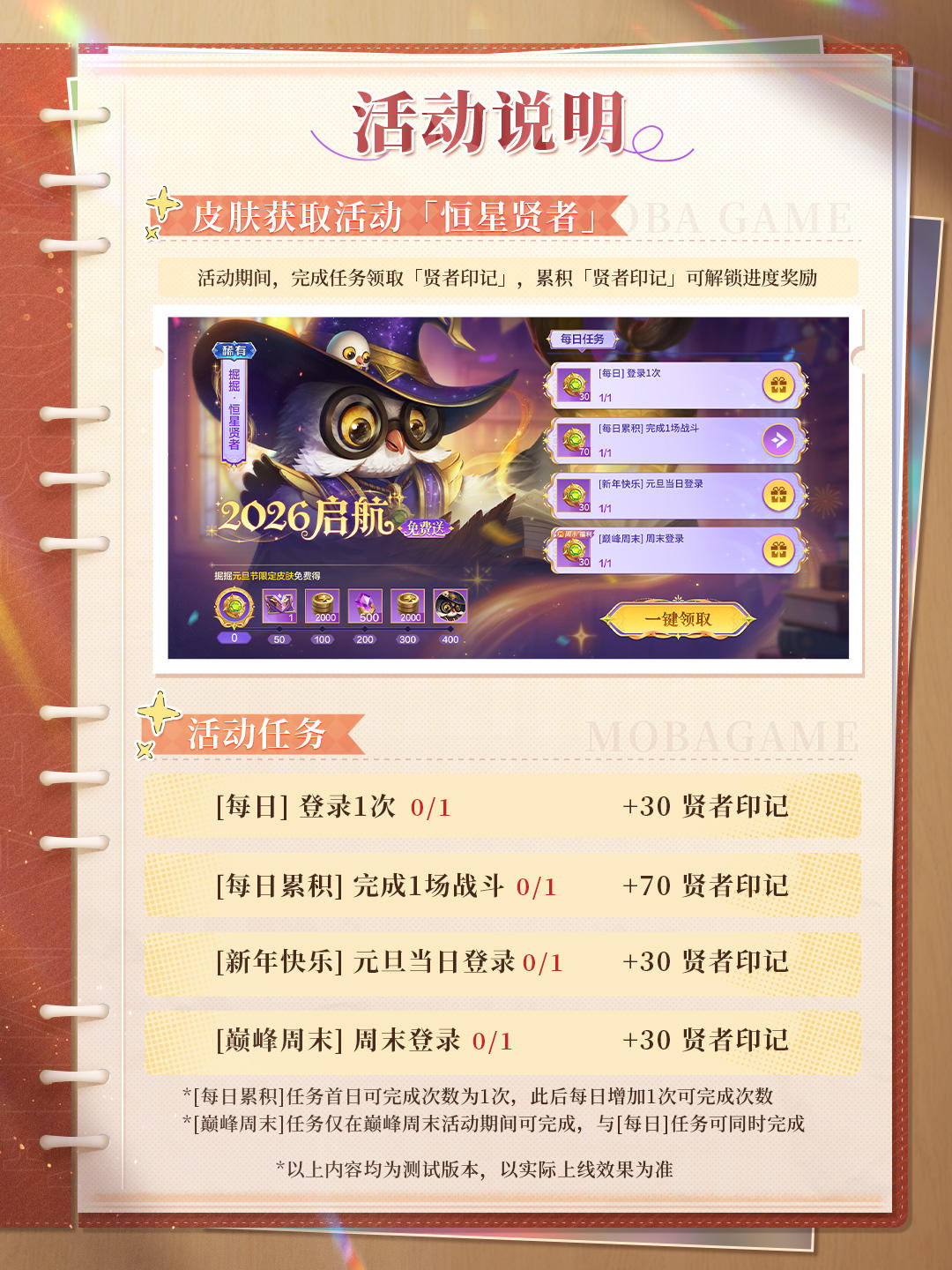 活动期间,玩家们可以在「2026启航」活动页面完成任务,领取「贤者印记」,累积「贤者印记」可解锁进度奖励活动详情请戳下方查看↓↓