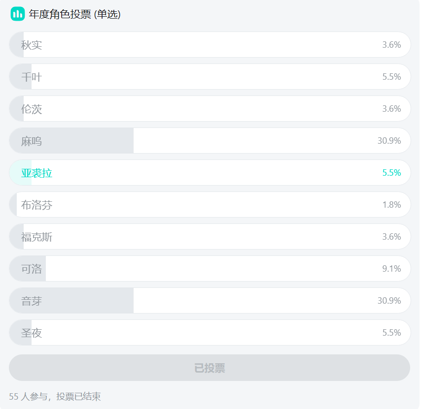 没想到年度角色竟然猫猫、音芽并列,那我们就来看猫猫和音芽阵容(其实在投票之前就在写了)