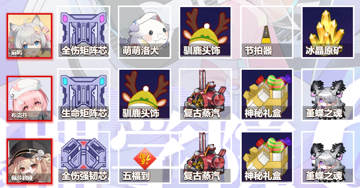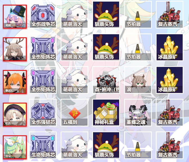 图中鹿帽必备,没有千叶所以冰晶原矿必备,剩下可洛头、节拍器、键盘、露头、火车头、白虎(湘湘)等有啥给啥。