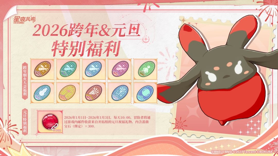 为庆祝2026年到来,《星痕共鸣》在元旦假期期间(1月1、2、3日)每日发放“元旦特别福利”蔷薇宝石(绑定)×300,合计蔷薇宝石(绑定)×900,请冒险者及时上线领取邮件福利呦!
