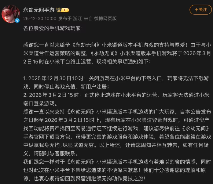 12月30日,《永劫无间手游》官方微博发布停运公告,因与小米渠道合作运营策略调整,小米渠道版本将于2026年3月2日15时正式终止运营,自此又一款小米服游戏迎来停运。