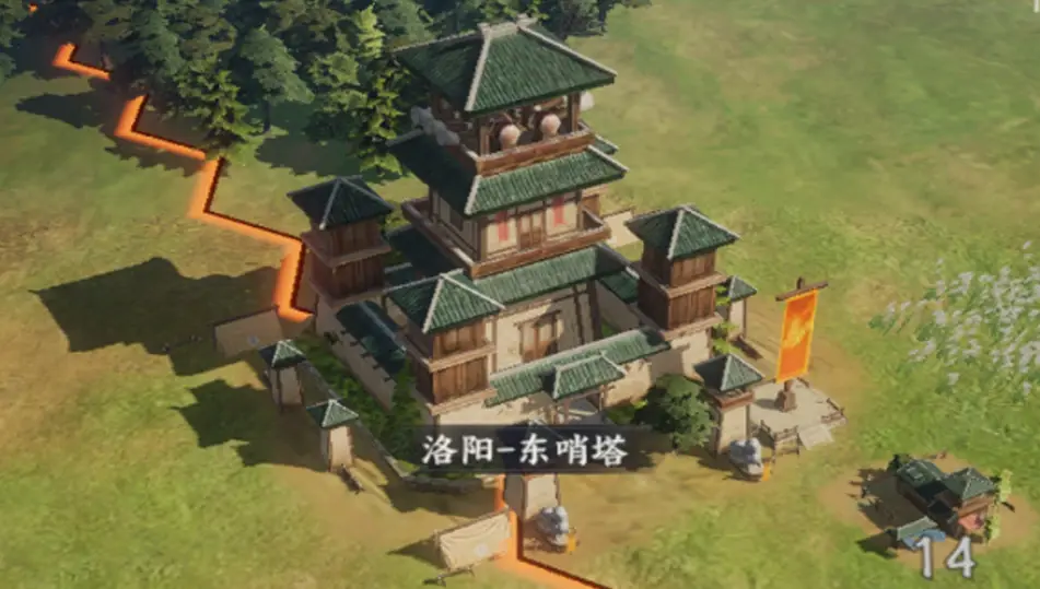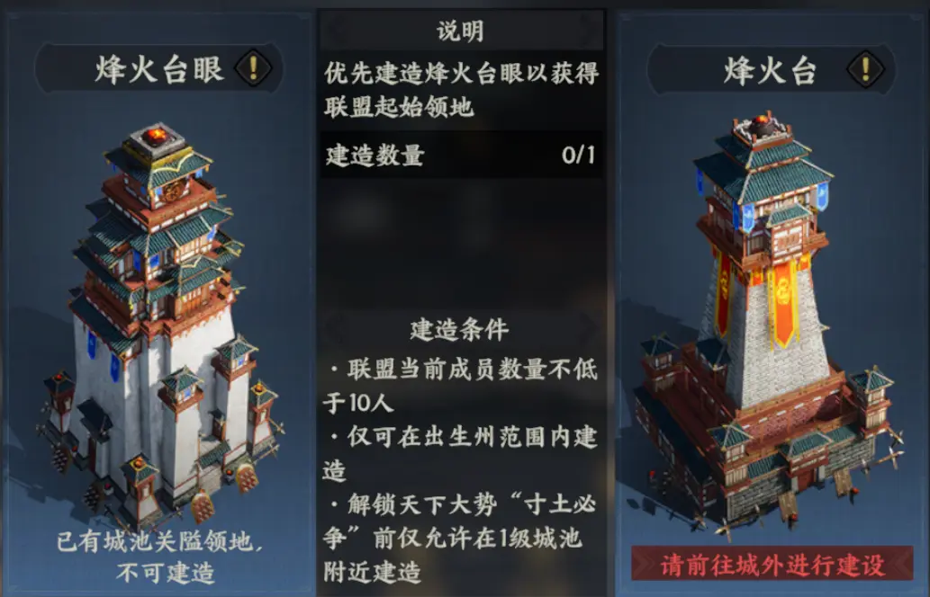 游戏中的哨塔为城池建筑,当本方领地覆盖城池哨塔后,即可正式发起宣战攻城,成为开启攻城战役的核心前置条件,延续了三国时期哨塔作为攻城夺地前置预警的功能。