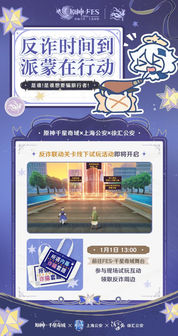 12月29日消息,《原神》附属子账号——原神千星奇域,发布公告,宣布「原神☆FES」2026-千星奇域将会联动上海公安、徐汇公安开展反诈宣传活动。