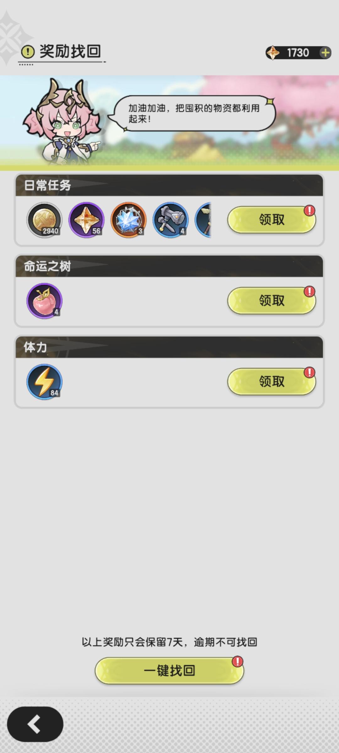 · 每日操作:领取所有固定体力(60),消耗30体力(满足每日最低消耗),并找回前一日溢出的70%(每天固定找回84体力,因前日溢出120)。