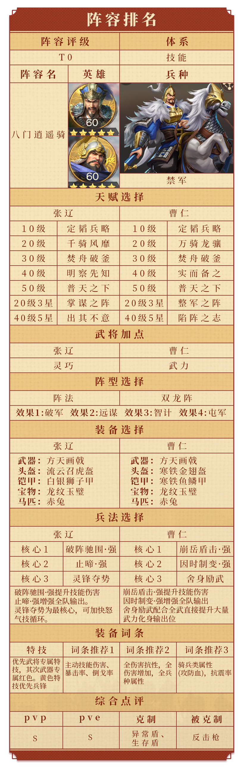 张辽卡包在S3也会进行返厂,张辽可以和S2强力武将组成技能骑体系,张辽提供暴击和爆伤,曹仁提供高额技能伤害和击飞。与此同时两名武将都有高额回怒,对比传统技能骑体系,曹仁还拥有高额回血,作战续航能力更强。