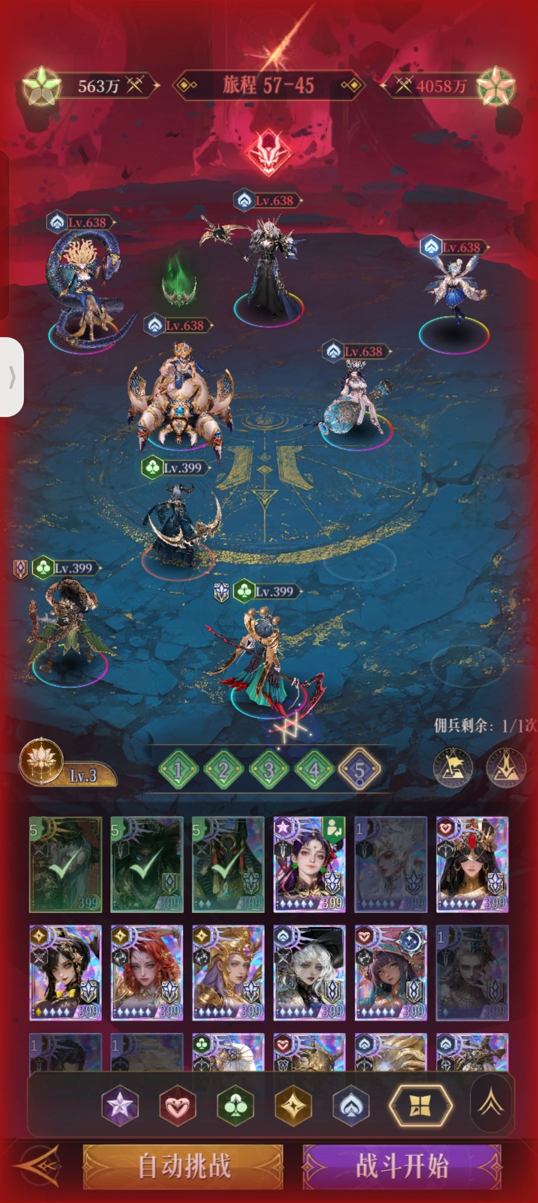 399级1400万战力,完成4觉,纯平民,超低练度,最后一关正常是大鹅在5队打黑桃的(其余四队思路大致固定,有时候财神给三相用的),不想凹了,采用哪吒召唤术