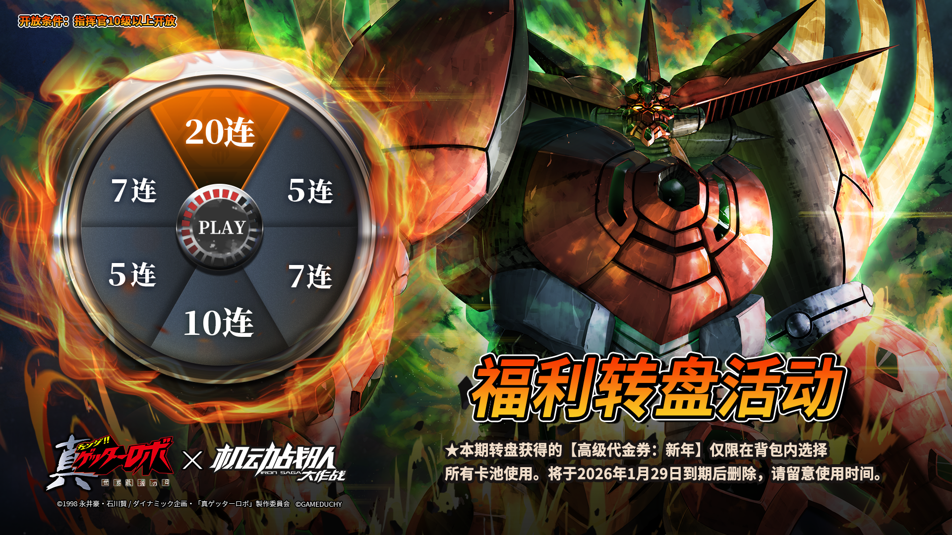 限时登录转盘活动将于更新后抵达,活动期间连续登录游戏,即可参与机体转盘活动。本次转盘活动持续7日,转盘获取【高级代金券:新年】并绑定部分卡池使用。
