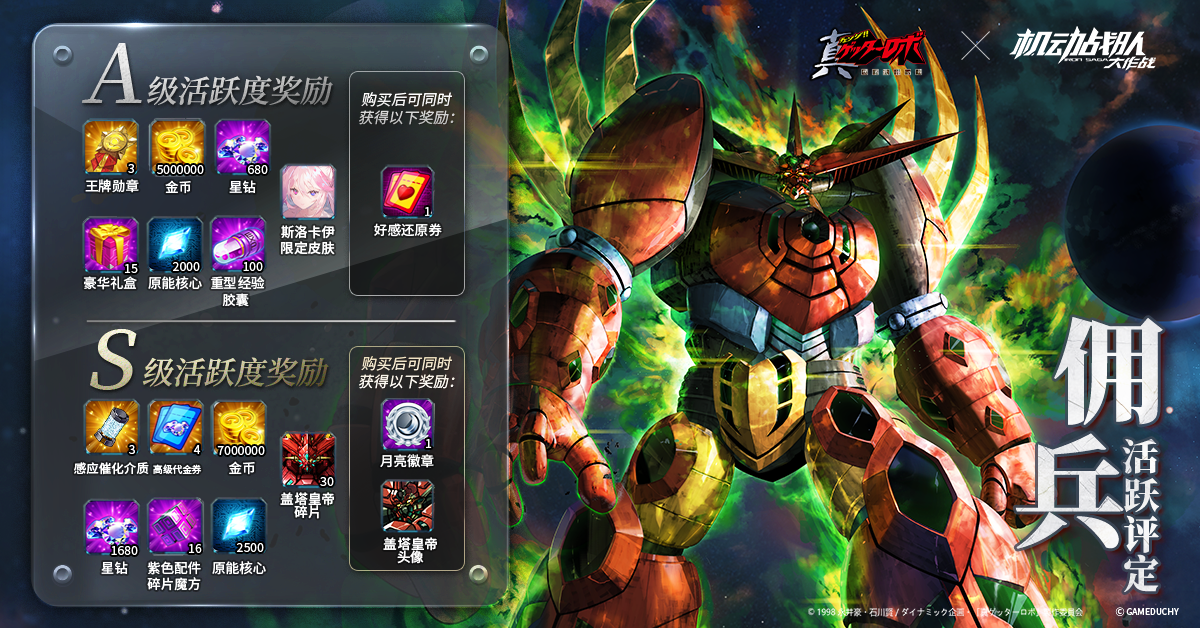 1、【新增】机体「盖塔皇帝」全新机体涂装,更新后指挥官可通过本期A级「佣兵活跃评定」获取;