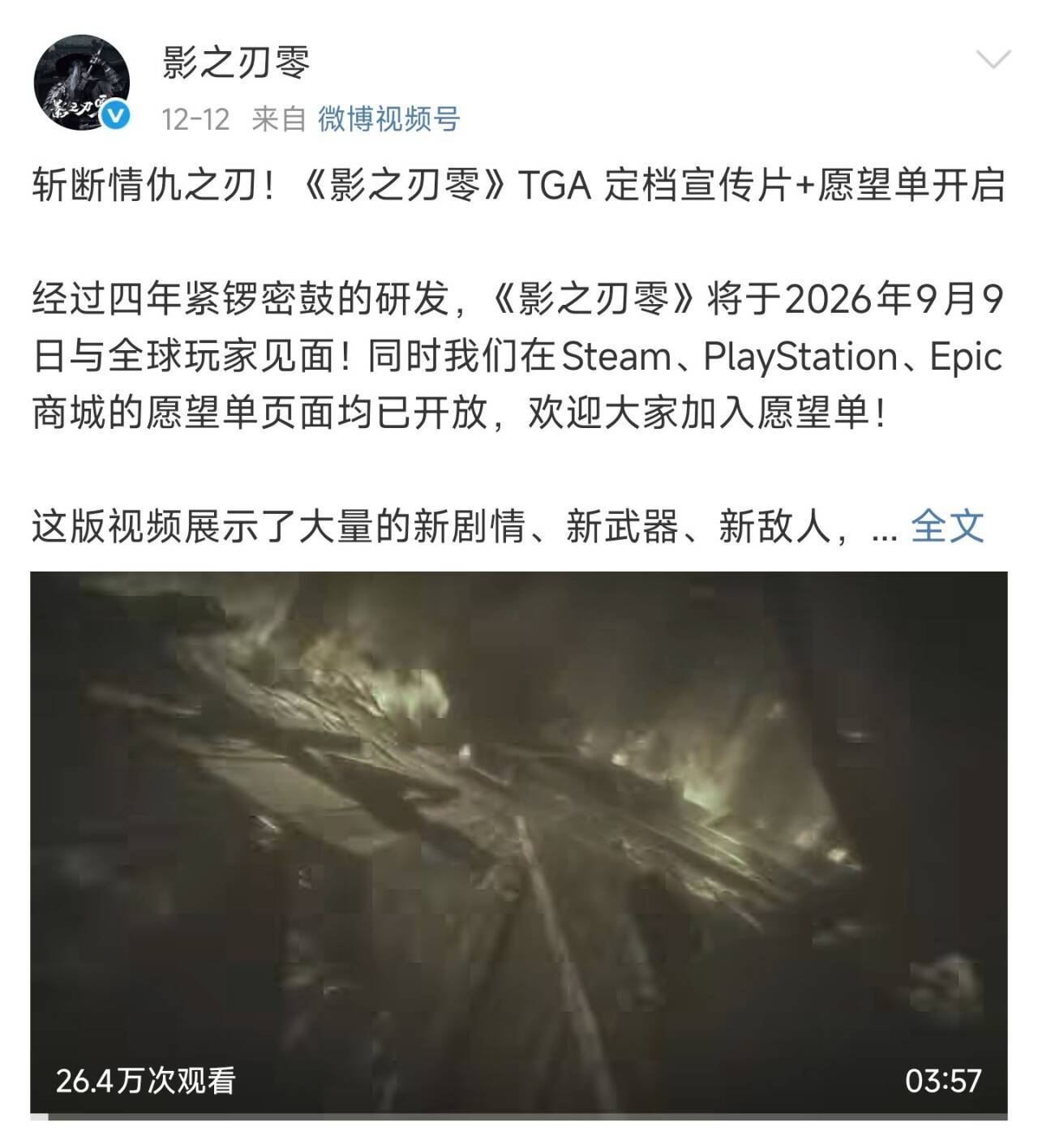 在12月12日TGA2025游戏颁奖典礼上,备受瞩目的国产武侠3A游戏《影之刃零》在颁奖典礼的最后阶段宣布定档2026年9月9日发售,同时公布了一段近4分钟的宣传片。