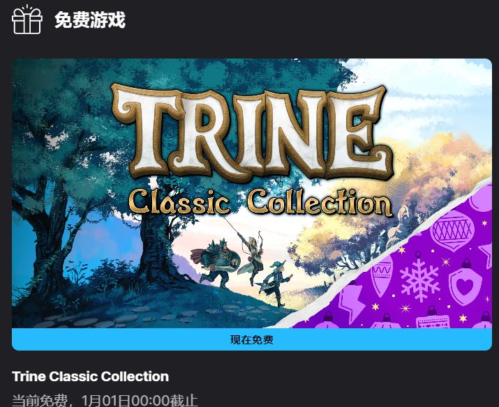 EPIC圣诞15连送福利持续放送,第十四款免费游戏敲定《三位一体 - 合集》,领取时间仅限12月31日至1月1日,限时24小时,玩家需抓紧时间入库,错过将无法补领。