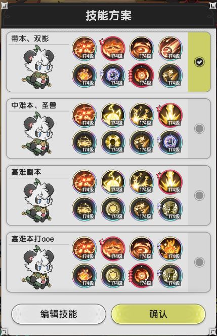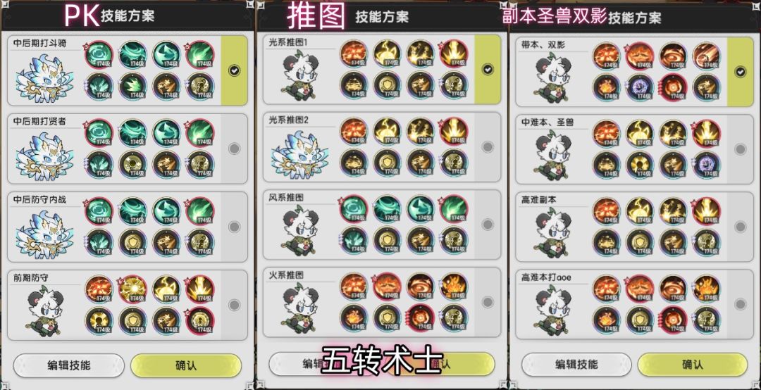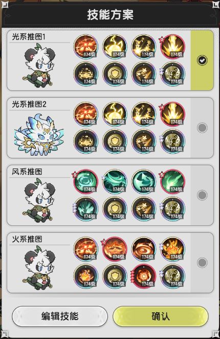 懒得放了,不难发现,很多方案都是一样的。反正就是风系两套、光系两套、火系两套,同属性的,输出一套,防御一套就行了。很简单的。总之过渡的时候,尽量用高品质技能代替方案中的技能。