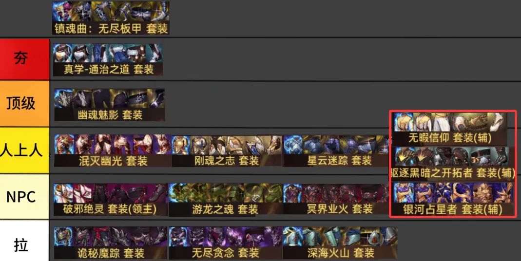 T3级“幽光套”“刚魂套”“星空套”,大致来说就是衡量标准。