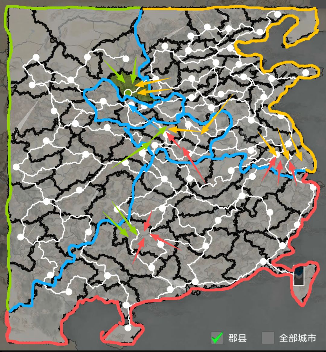 举例:以吴蜀举例,吴国蜀国想要进攻地方领土,必须通过“建业”郡。俩国可以随时发兵建业进行交战,但如果魏国部队想进攻吴国本土,需要放弃魏国内所有据点并迁移到建业据点,方能进攻吴国领土。