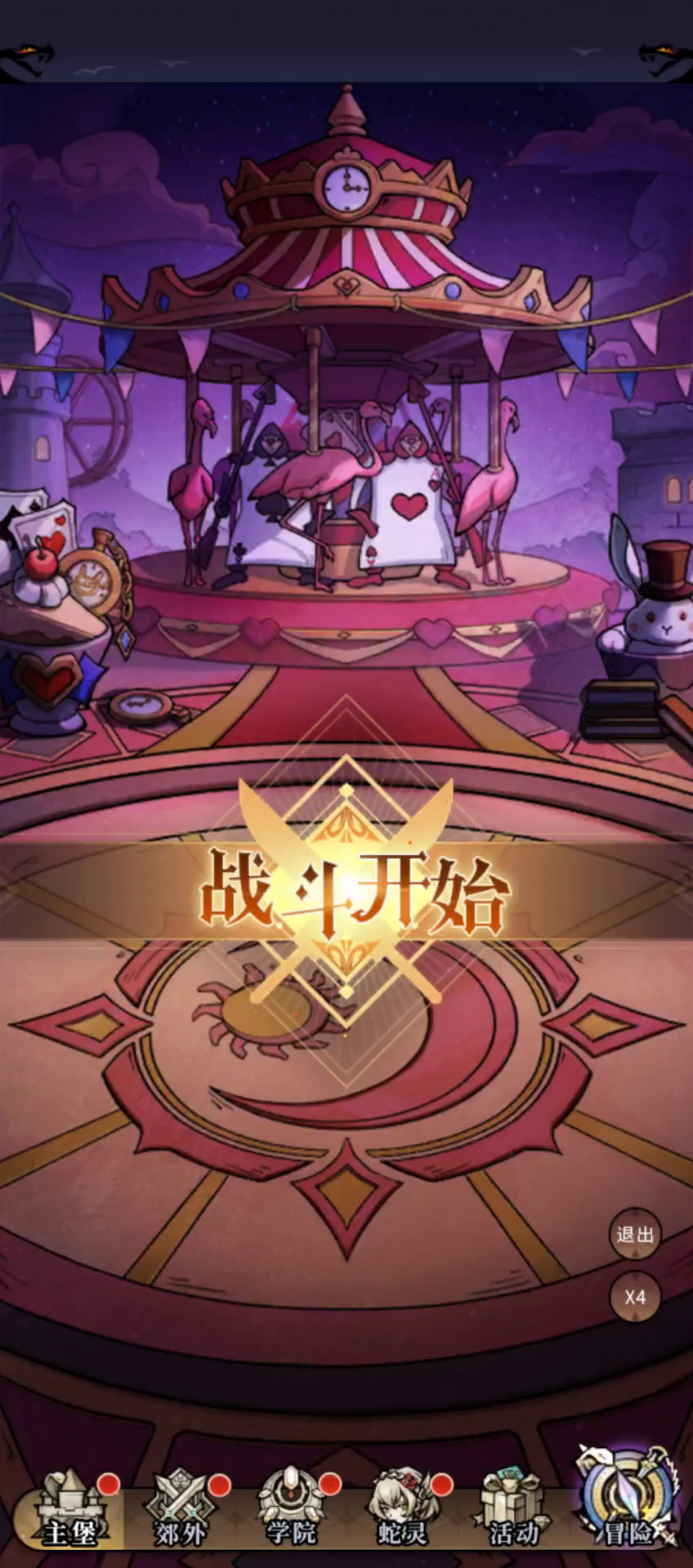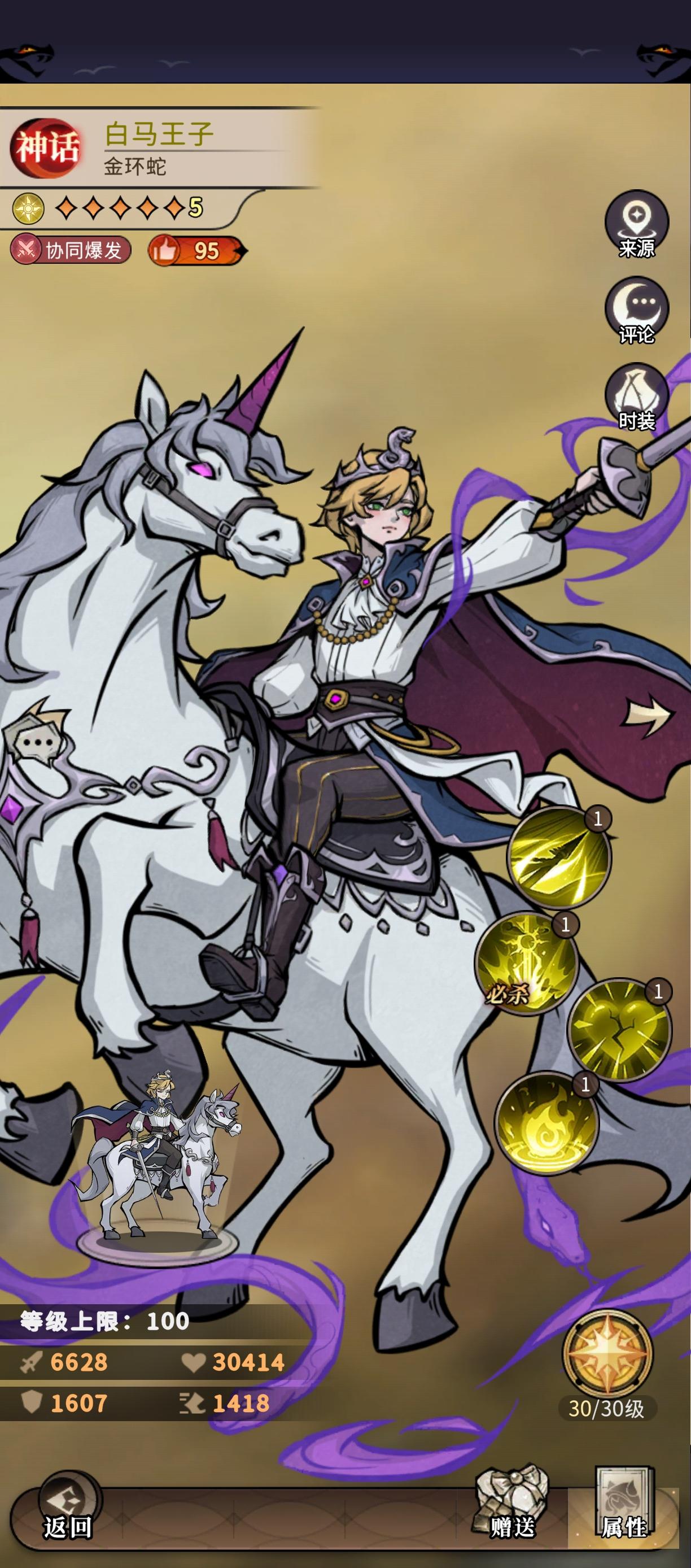 下一种情况是白马王子,这个卡在我心里的定位是稳稳的对策卡,他的技能是打对位的人,而且塔里的白马王子伤害巨高,所以一般是直接把我们c切掉导致我们输出不足过不去,所以这里建议把阵型切换为和塔里一样的阵型,这样方便我们看谁是白马王子对位,然后把前排或者能站得住的角色放在白马王子对位上,只要这个角色能站得住,这关基本上就可以过,我们火毒阵容本身就是肉队,所以很轻松能顶住,用红心女王或者狼外婆站对位能够轻松打过