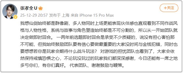 “仙剑始终都是群像剧,多人物同时上场更能表现伙伴感也直观看到不同作战风格与人物性格,系统与故事与角色塑造始终都是不可分割的,所以从一开始团队就选即时回合。”