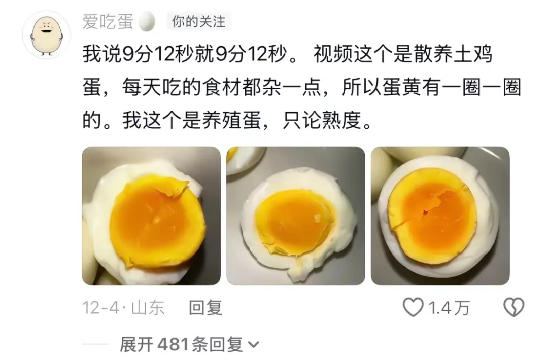 为什么呢?网上有无数条水煮蛋的教学视频或帖子,但它们的时间单位只会精确到分钟。唯独“爱吃蛋”用一套严谨到极端的标准,创造了一个精确到秒的标准答案。举个不太恰当的例子,可能相当于某个停滞了多年的基础科学领域,出现了新的研究突破。
