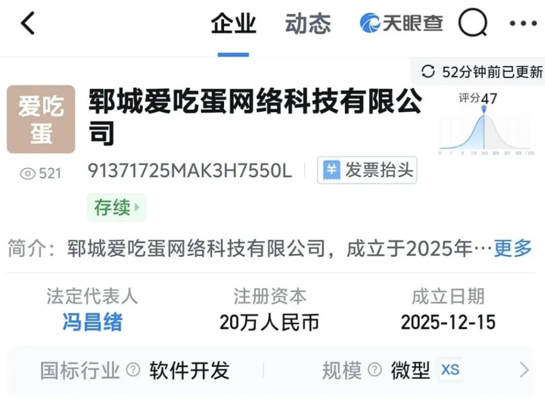 “爱吃蛋”还火速注册了自己的公司。近日天眼查信息显示,冯昌绪(爱吃蛋本名)注册了“郓城爱吃蛋网络科技有限公司”,注册资本达20万元,由其100%持股,经营范围包括互联网销售、直播技术服务等。
