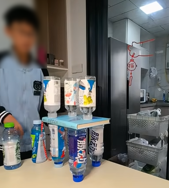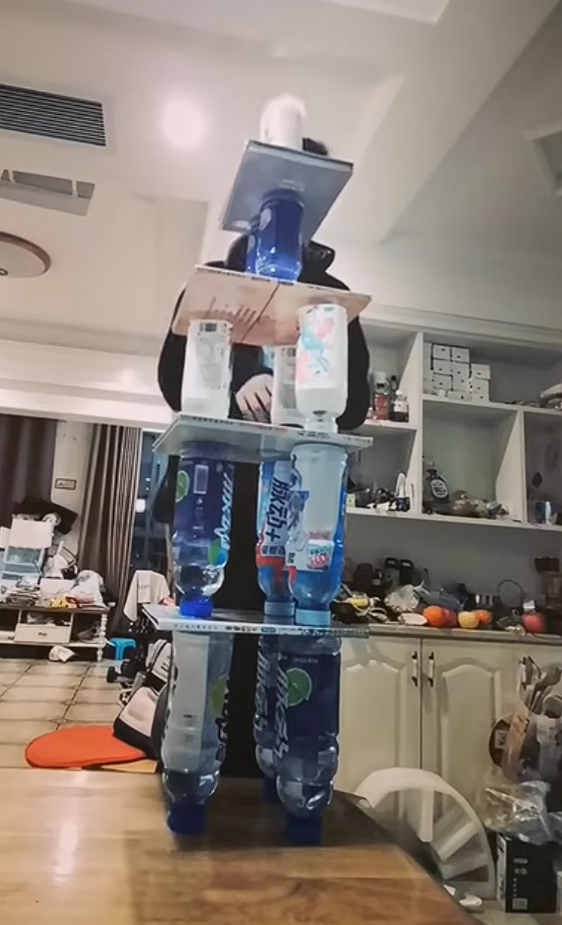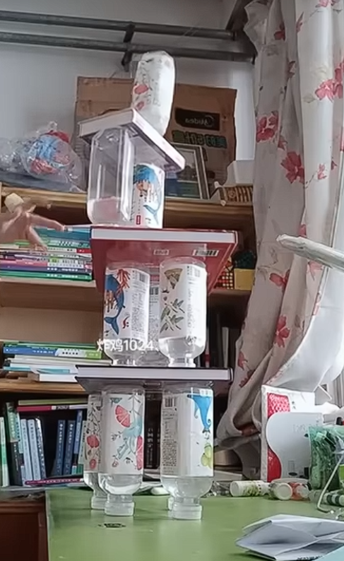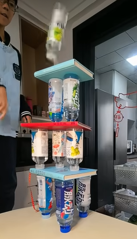 现在倒立水瓶已经不再满足于倒立一个水瓶,现在的挑战是“塔”——需要先倒立水瓶作为支点,然后用硬壳书建层,再不断向上。