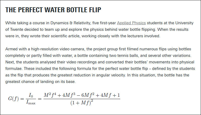 想要真正登堂入室,则需要加深对不同瓶子的理解,思考他们的异形结构会让瓶中液体的重力产生何种变化,计算不同地区的重力,然后计算风阻,再配上一点点运气,最后才能实现随时随地都能成功倒立水瓶。