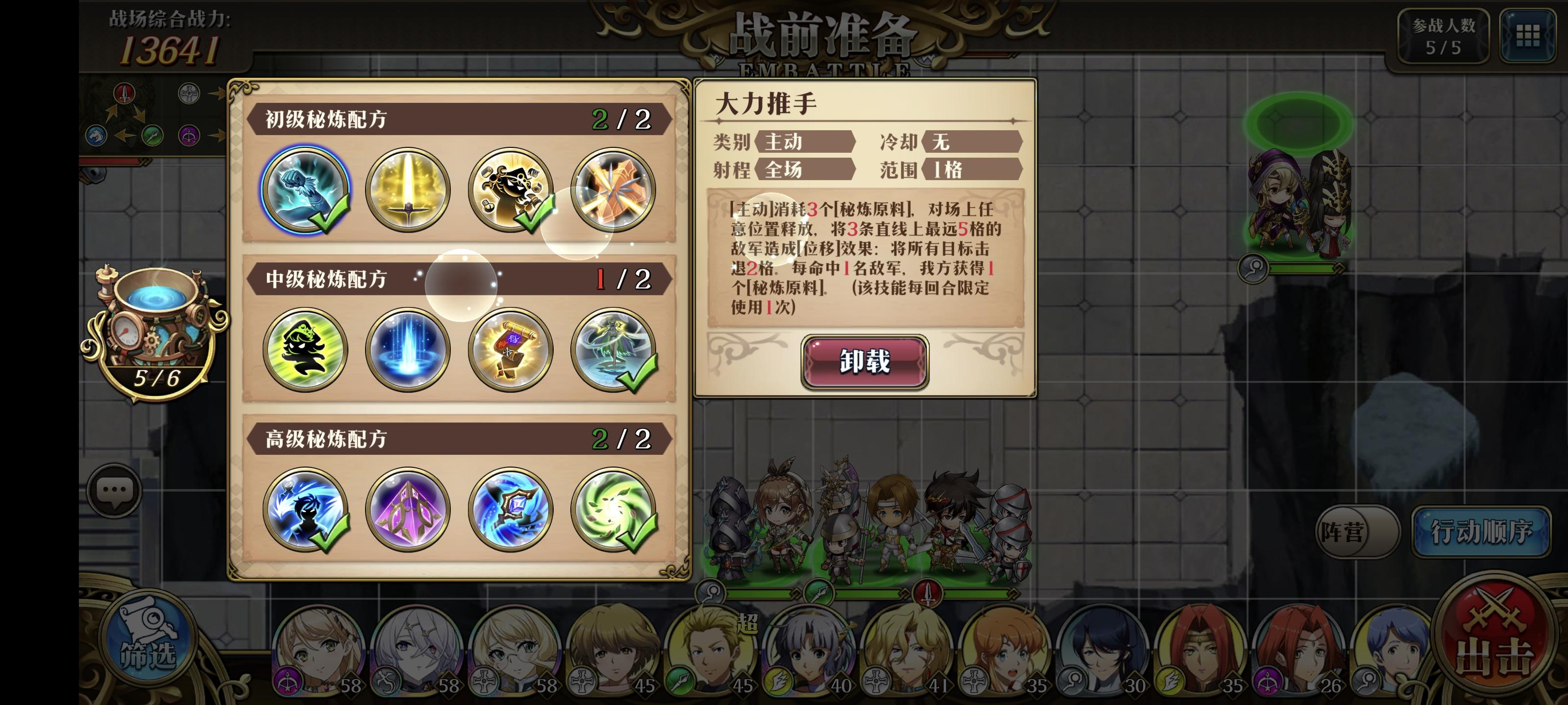 终于在最后一天过了(氪佬和老区大佬不用理睬毕竟练度和角色多打法就更多),练度不用太高,技能截图有,核心技能主要就是最后两个。 第一回合皮耶鲁(只要有拉技能就好)把帝国幽魂拉上来,马修往皮上面一格开超绝,莱莎海胆加普攻幽魂,利亚纳(要带sr的移动鞋子方便占格子)踩格子给莱莎再动,技能推右边4个怪往右边推,召唤采集机器人在下方的箱子,然后休息(再动的时候直接原地不动,为后续铺垫),复制幽魂,走位要地板上(不然怪物回合怪会直接分散,对后续不利),幽魂黑洞怪物幽魂(主要为了禁疗,没有就重开到有),莱莎两次海胆,艾希恩站骑兵打不到左边格子再动莱莎秒掉幽魂(如果能死就跑远点免得第一个回合被秒)