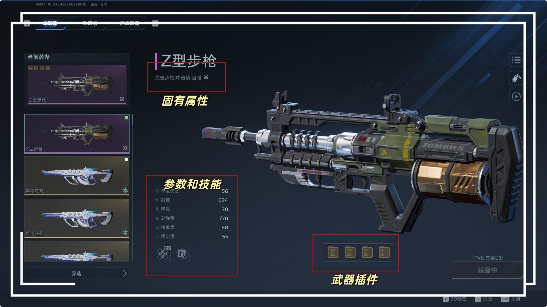 ·固有属性:首先看上图:Z型步枪,突击步枪|中倍镜|自瞄|物理属性。