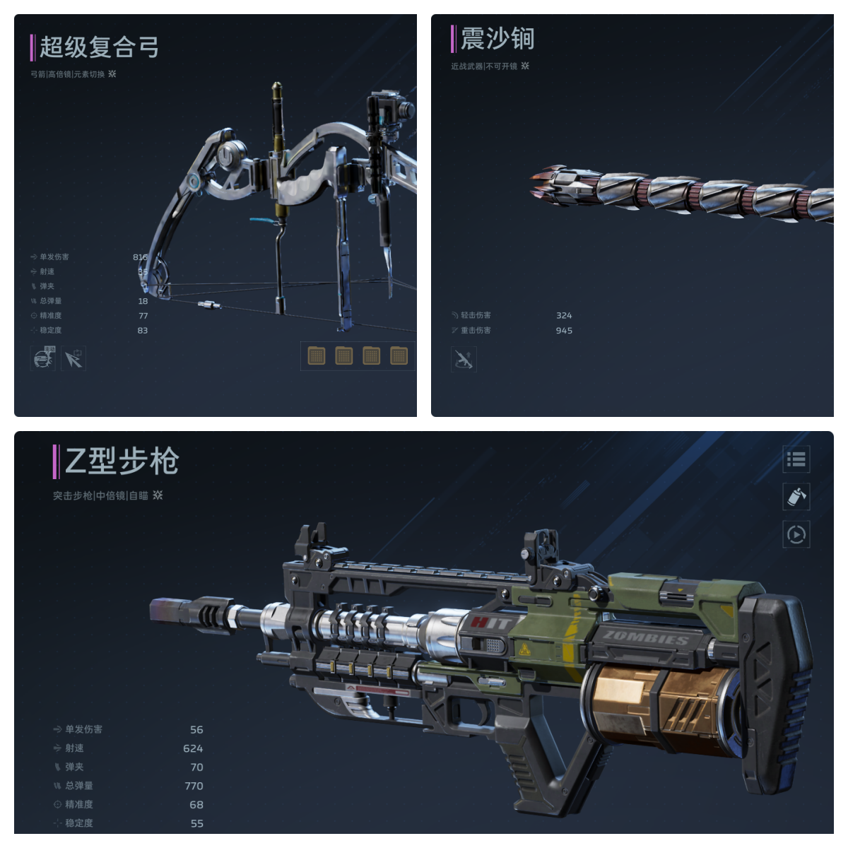 步枪是紫色武器,相对好获取,培养难度低,步枪做为入门首选,可见Z型步枪泛用性相当强。复合弓自带两个技能,主要是一技能进入狂热射击状态,期间使用武器射击会自动消耗后备弹药,且射速提高。震沙锏带技能可以提升角色造成的物理伤害,和步枪十分搭配。