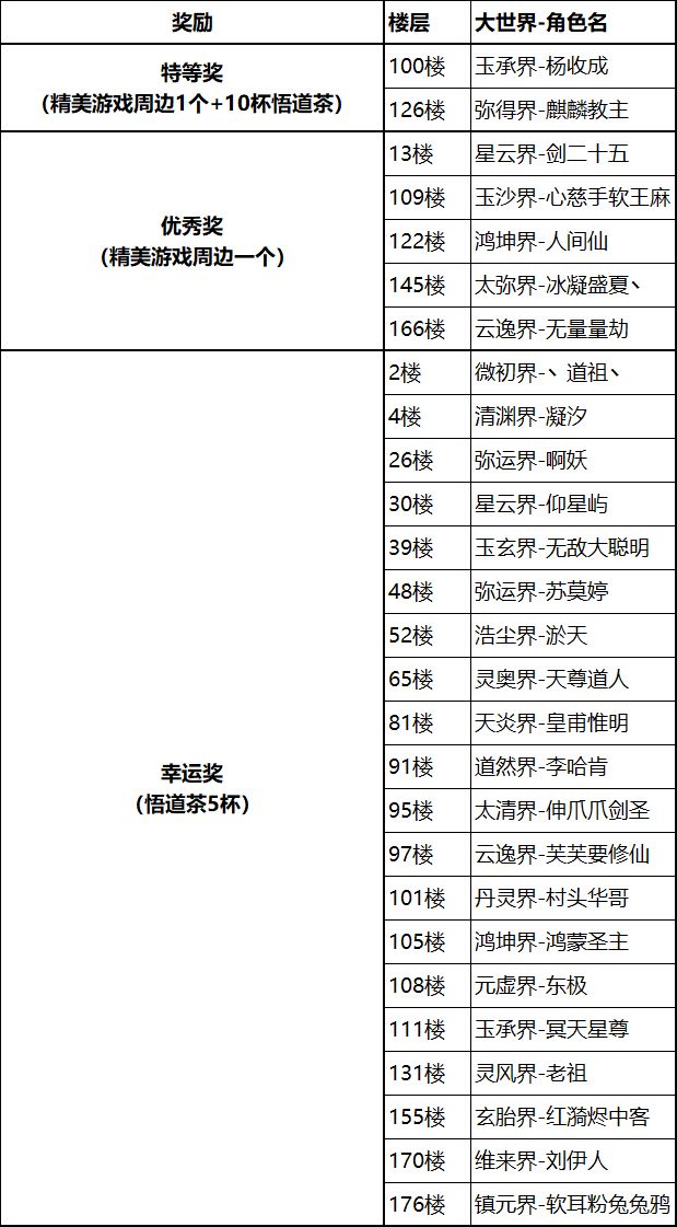 以上是此次活动获奖名单,获得周边奖励的道友可联系下客服QQ:3440083604登记领取游戏周边奖励,恭喜各位道友中奖喔!