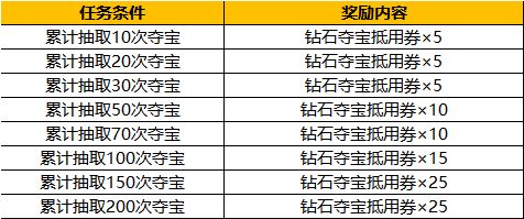 活动内容:活动期间,参与夺宝,即可获得一定钻石夺宝抵用券返还哦!~