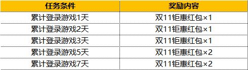 活动内容:活动期间,累计登录游戏达到指定天数,即可获得双11钜惠红包!使用红包有机会获得钻石×50、钻石×100、钻石夺宝抵用券×1、钻石夺宝抵用券×5中任意选择一种道具。