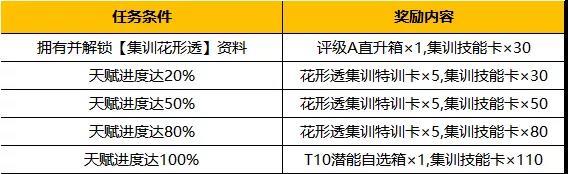 活动内容:活动期间,天赋达到指定条件即送集训技能卡等好礼。