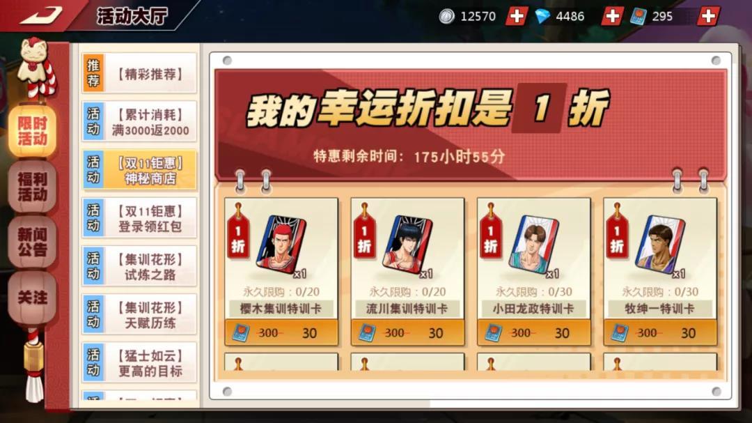 活动内容:活动期间,神秘商店刷新各类神秘道具,特训卡1折等意想不到的超低折扣,快来试试手气吧!