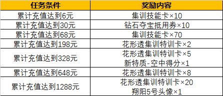 活动内容:活动期间,累计充值达到指定金额,即可获得花形透集训特训卡,更有翔阳5号头像哦。