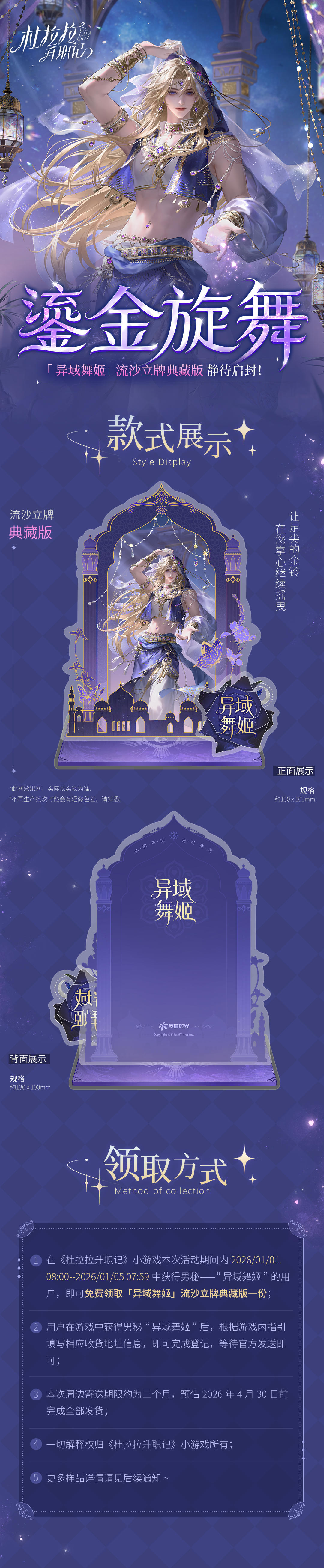 只要你在《杜拉拉升职记》小游戏本次活动期间内【2026/01/01 08:00--2025/01/05 07:59】中成功 拿下「异域舞姬」,这份心动周边就属于你!