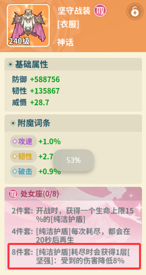 从套装效果我们可以看到,纯洁护盾耗尽后,20秒内会再生,护盾就算没有被打爆,过10~15秒(大概)也会消失,因此就可以叠加8件套的效果,减伤8%,而这个减伤是加算的,简单来说,假设30秒能叠加一层减伤,那么300秒的时候,就能叠加10层减伤,减伤率高达80%,加上玩家本身的减伤、护盾等效果,即可达成“无敌模式”。![[表情_酷]](https://img.tapimg.com/market/images/edd50e702f508971043f5619f686740e.png)