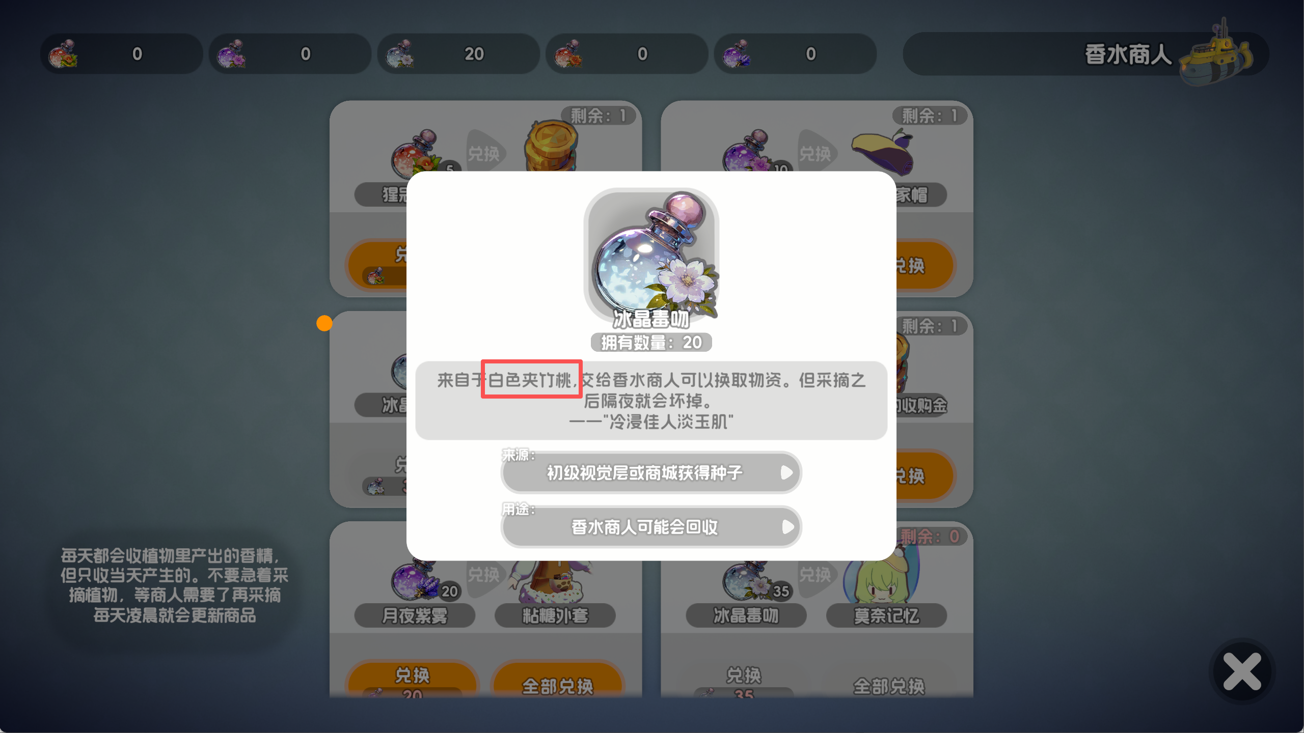 商店点击香料里面会介绍今天收购的香料是产自什么花卉的,商店每日都会刷新,收购的香料也是会变的,鸡岛还有一个香料收购商,原理是一样。