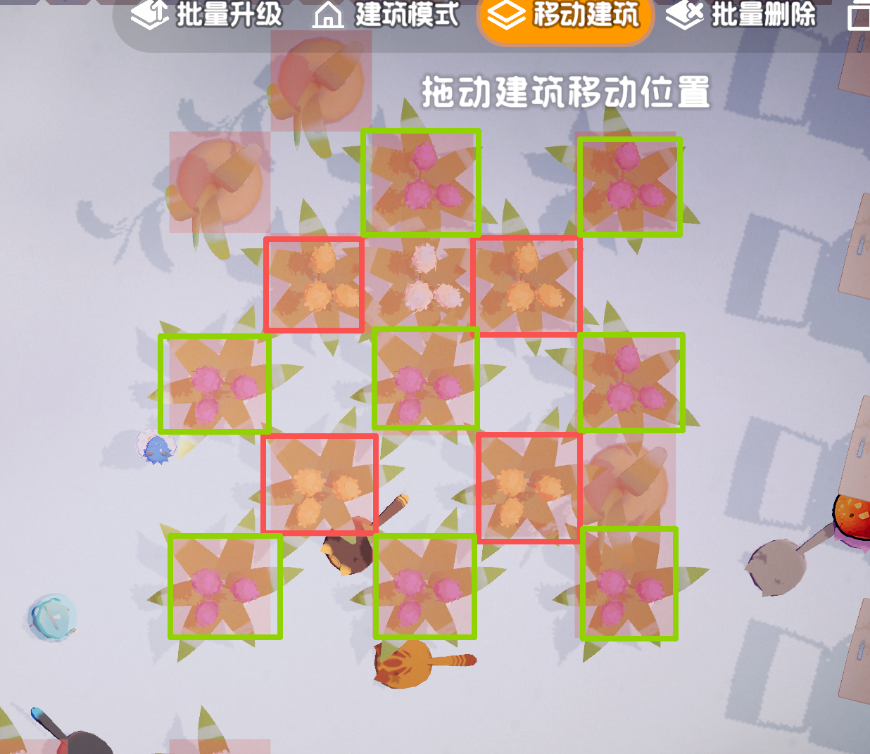 关于繁殖摆放问题,论坛内种花的帖子也都讲的很清楚我这里也示范一下,就类似棋盘布局的摆放方法,图中我黄紫中间空出来的地方就会繁殖出来白色的花,其他颜色同理,或者只有两个花斜对角放也是一样,记得不要种在水泥地上!