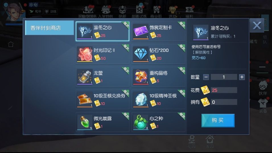 收集指定数量的香伴时刻礼券,即可在香伴时刻商店兑换称号·凛冬之心、饰裳定制卡、时光印记 Ⅱ、钻石*200、龙萤、重构晶格、10级圣核自选券、10级精神圣核、微光晨露、心之种、原态元素、冥界之焰、稳态晶块、龙威铸铁、诫律锆石、进化石、秘密指令、娃娃机硬币等好礼哦~