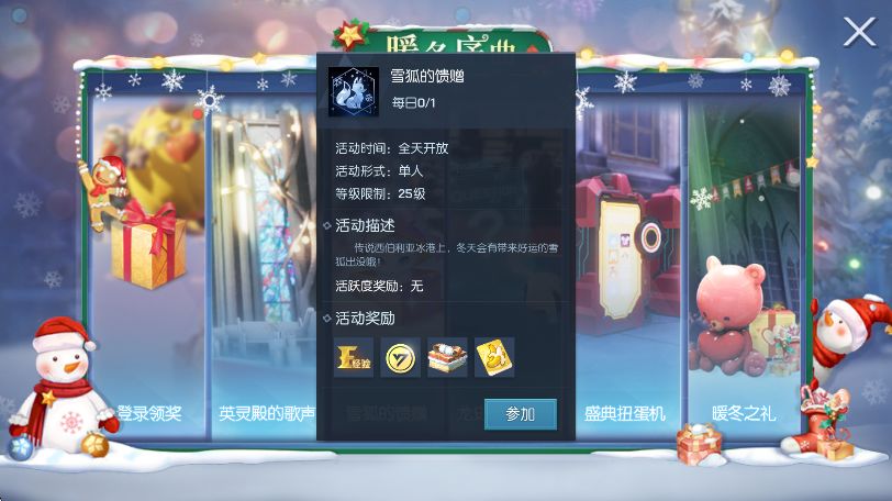 12月31日6:00-1月14日24:00期间,每天去西伯利亚冰港寻找伊芙寻找小雪狐,即可获得经验、金币、落雪暖绒礼盒、香伴时刻礼券等好礼哦~