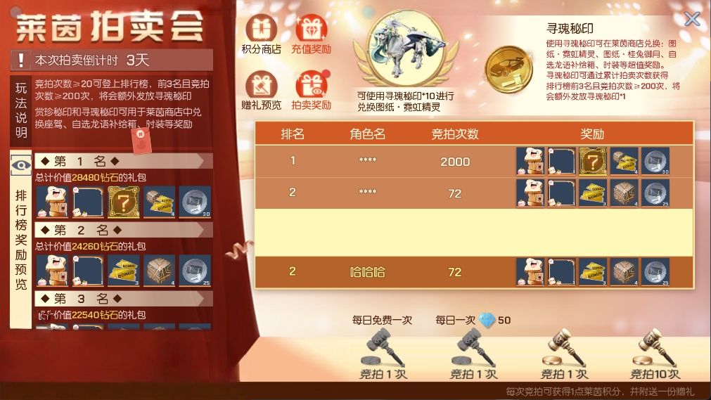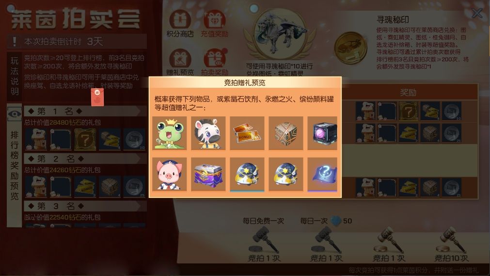 竞拍次数≥20次即可登上莱茵排行榜,本场拍卖结束后,排行榜前3名且拍卖次数≥200次的竞拍者,还将额外发放寻瑰秘印!拍卖会期间参与每日充值,也可领取包含一槌定音在内的超值奖励!