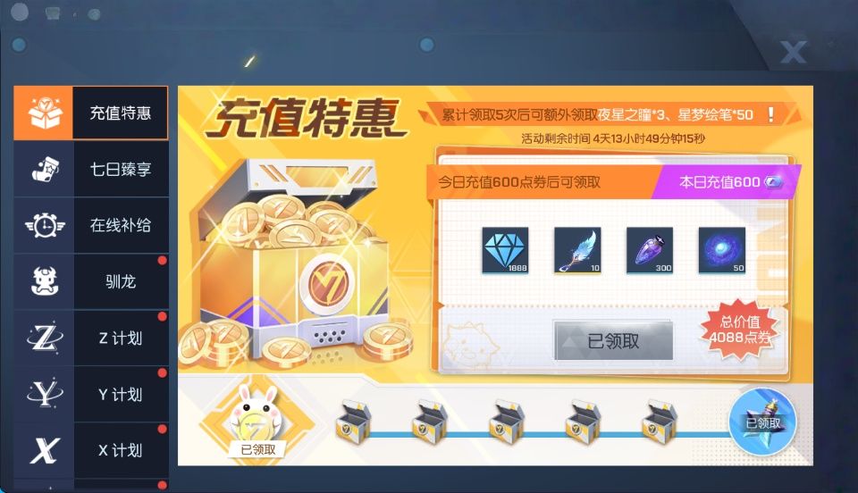 1月1日至1月7日23:59,每日充值600点券可在活动界面领取每日额外奖励,活动期间累计领取5次奖励后,可以额外领取绘梦赠礼!(更新完成活动开启后的充值才会计入每日充值目标,有需要的同学请在更新后进行充值哦)