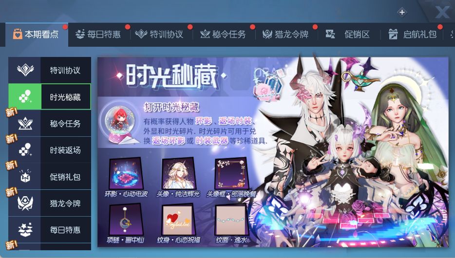 1月1日00:00至1月28日23:59,打开时光秘藏必定获得时光碎片*1且有几率获得外显:包括全新环影·心动电波、时装·千夜奇谭、发型·千夜奇谭、时装·魔龙少女的传说、发型·魔龙少女的传说、头像·纯洁辉光、头像框·部落晚餐、耳环·画中仙、纹身·心恋祝福、纹面·逸水、聊天背景·玉影荷香。