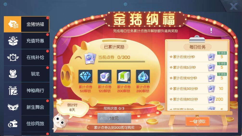 1月1日至1月7日23:59,积累活跃度、累计在线时长可以向金猪中存储点券,并根据存储点券数量解锁额外道具!点券累计到一定数量后,可花费18元购买金猪,获取大量点券与道具奖励!