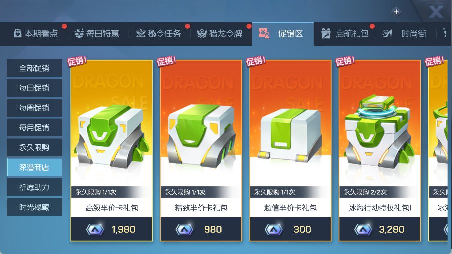 商区-促销区-深潜商店页签中同时上架了高级半价卡礼包、精致半价卡礼包、超值半价卡礼包、冰海行动特权礼包,本期返利大幅提升,且无需下潜深度解锁,欢迎同学们选购!