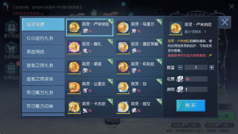 12月31日更新后至1月29日更新前,参与英灵祈愿活动可获得卢米纳拉灵魂碎片、乌里尔灵魂碎片、返场环影·金韵奏歌、返场时装·曦光的雀舞·衣、返场发型·曦光的雀舞·发、返场头饰·曦光的雀舞·头饰、返场背饰·月兔摇珑、返场头饰·云渺归燕、返场面饰·不萦于心、返场头饰·昼虫夜灯、手办·凯撒-水天、手办·零-水天、手办·路明非-水天、手办·绘梨衣-暮歌、繁荫之信、丰盈之瓶、萌光沙漏、以及英灵礼物、智慧初源、11级圣核兑换券等各种超值道具!