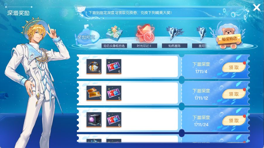 在深海下潜到指定深度还可以获得玩趣工坊礼券和玩趣工坊奖章,兑换动态头像框自选礼包、时光印记II等超值奖励!