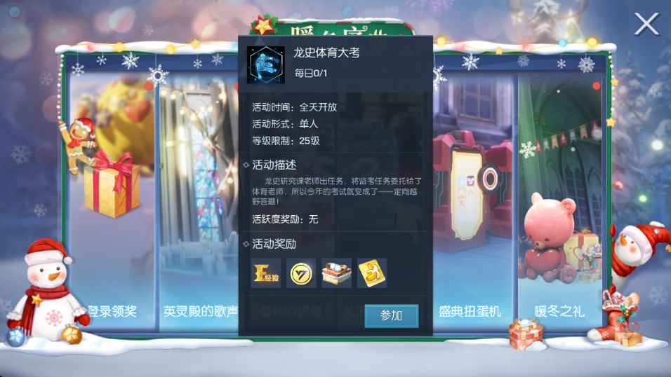 12月31日6:00-1月14日24:00期间,每天去卡塞尔学院寻找艾瑞斯完成定向越野答题,即可获得经验、金币、落雪暖绒礼盒、香伴时刻礼券等好礼哦~