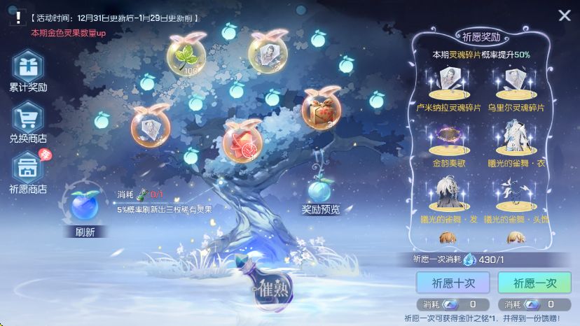本期活动中,祈愿获得灵魂碎片的概率提高50%,并且灵树果实品质提升,每次刷新至少生成2枚金色灵果,暴击产生3枚金色灵果,且灵果中出现灵魂碎片的概率提高,助力同学们与心仪的英灵并肩作战!