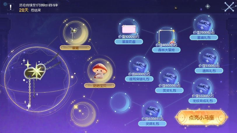 1月1日10:00起至1月28日23:59,点亮最多十颗小马座星星,随机获得藏于其中的曜藏·面饰,星星奶盖·聊天气泡,菇菇宝贝·头像,森林大冒险·头像框等限定奖励!还包含灵境礼包、英灵礼包、遗阵礼包、星魂礼包等赠礼!点亮全部星星即可获得包括时光印记II在内的全部限定大奖!!